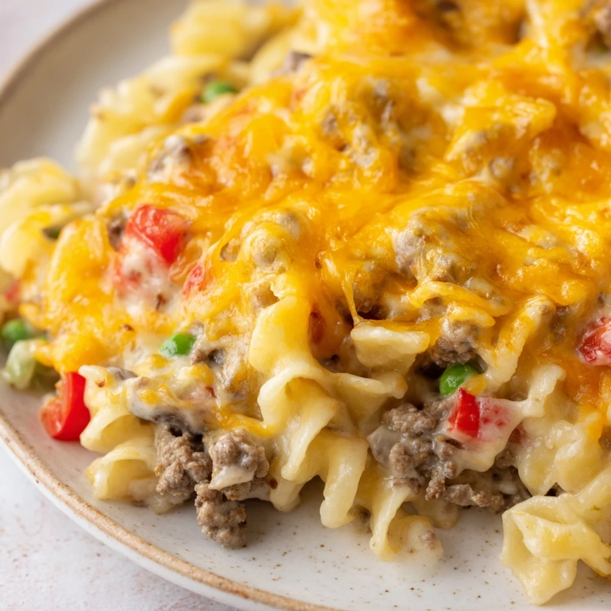This hearty baked dish combines egg noodles with seasoned ground beef in a creamy mushroom and tomato sauce. Topped with melted cheddar cheese, it creates a golden, bubbly crust that's sure to please the whole family. The preparation comes together quickly—just brown the beef, mix in the vegetables and sauces, combine with noodles, and bake until perfectly melted and golden. Add frozen peas or diced bell peppers for extra color and nutrition, or customize with your family's favorite vegetables.