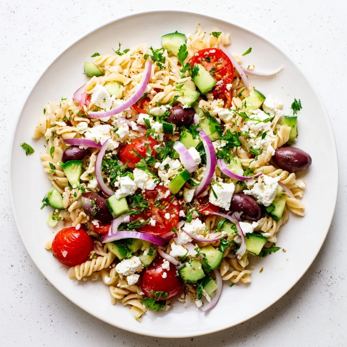 This refreshing Mediterranean dish combines al dente pasta with crisp cucumber, cherry tomatoes, red onion, bell pepper, and briny Kalamata olives. The star ingredient is tangy feta cheese, which adds creaminess and authentic Greek flavor.