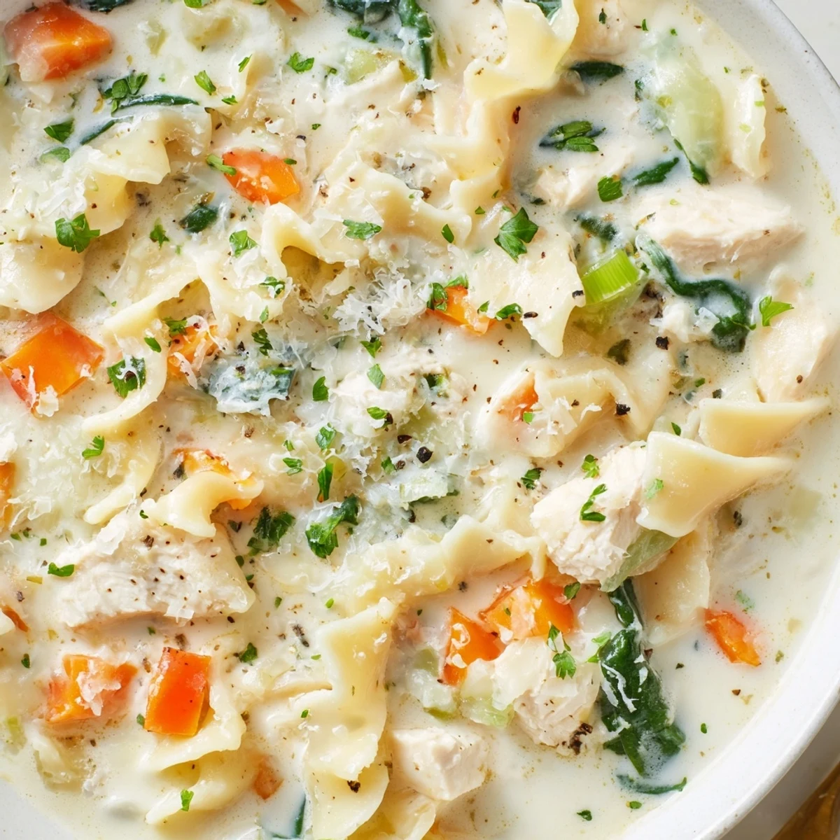 This hearty Italian-American soup captures all the comforting flavors of white lasagna in bowl form. Tender chunks of chicken simmer with aromatic vegetables, broken lasagna noodles, and a blend of Italian herbs before being enriched with heavy cream and melted cheeses.