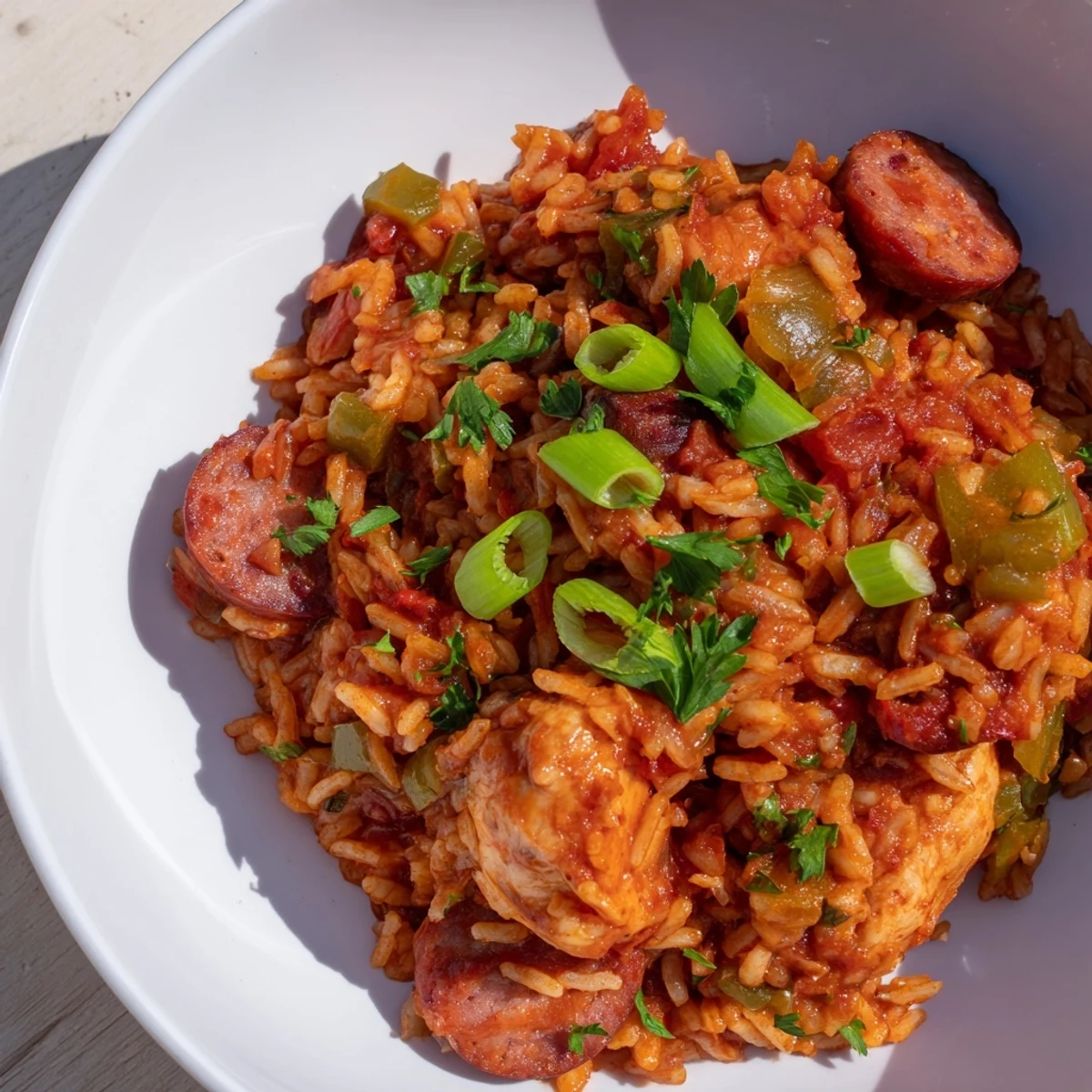 A classic Creole one-pot meal blending tender chicken thighs and savory beef sausage with aromatic vegetables and perfectly seasoned rice. This hearty dish simmers to a rich, flavorful finish, offering a balanced taste of paprika, thyme, oregano, and cayenne pepper. Garnished with fresh parsley and spring onions, it's ideal for a comforting main course that brings warmth and spice in every bite.